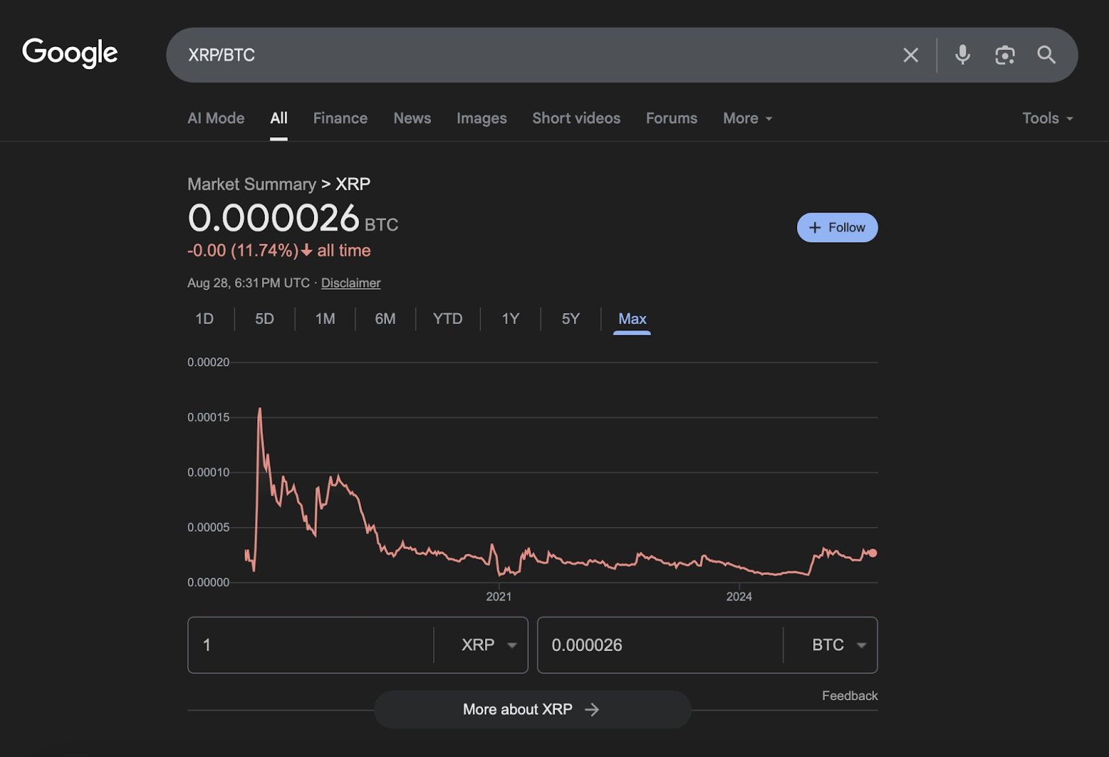 Winning for individuals and small businesses is not about timing the market. It’s about switching to the long view of Bitcoin as the denominator. As we can see, when you do that with XRP, it’s crashing in terms of Bitcoin.